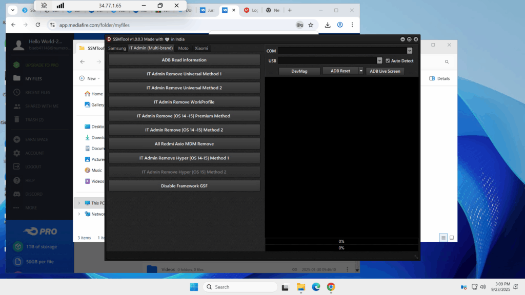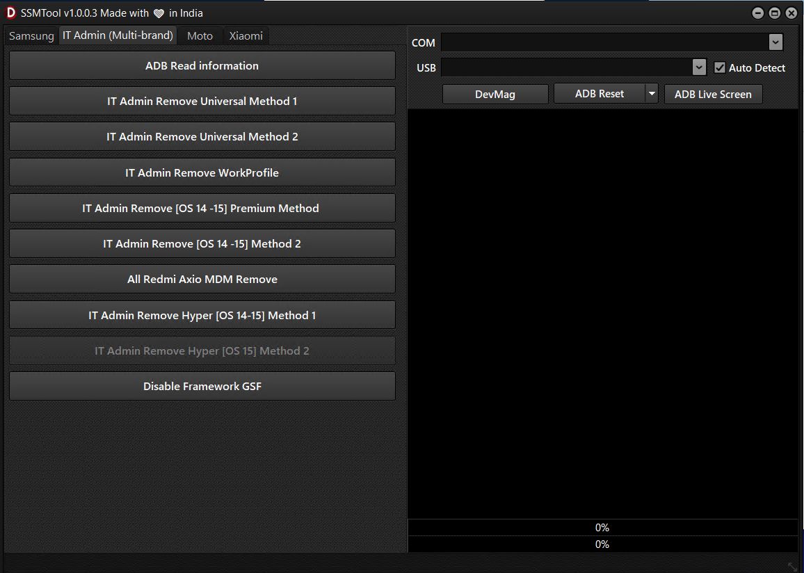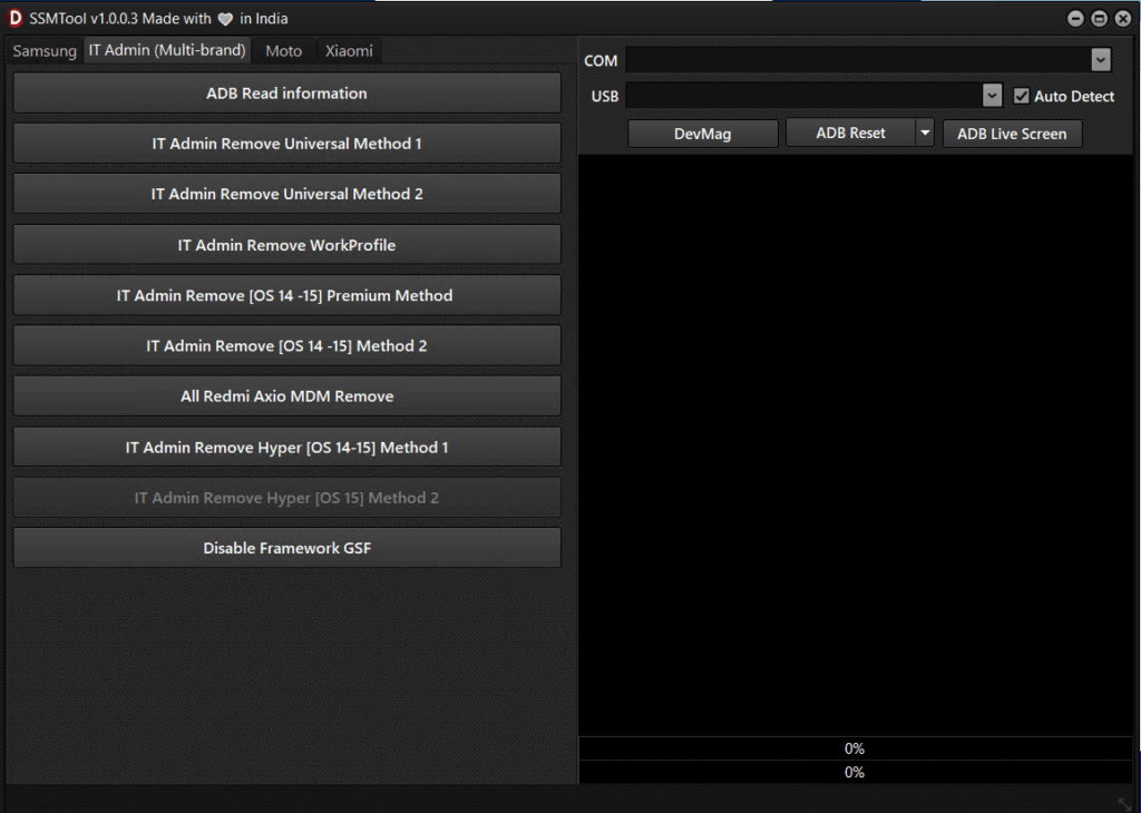 SSM Tool v1.0.0.3 is a Windows utility focused on Samsung KG workflows, IT-Admin/MDM removal (authorized use only), Odin-style flashing, and select Moto/Xiaomi helpers. This build is reported as a “free/loader” release with bug fixes and new methods. As with any service software, use only on devices you own or are explicitly authorized to service.