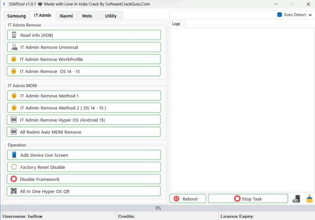 SSMTool v1.0.1 consolidates practical shop actions for Samsung, Xiaomi and Moto, plus an IT-Admin section focused on removing enterprise/work-profile controls with methods targeting Android 14–15 and HyperOS scenarios. The interface is straightforward with clear status feedback.